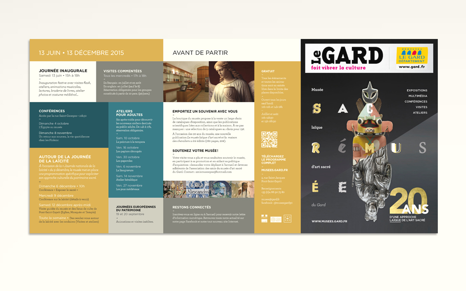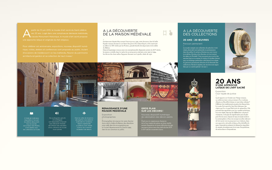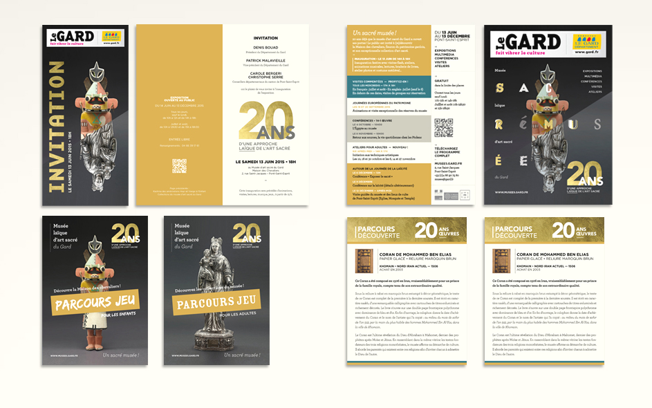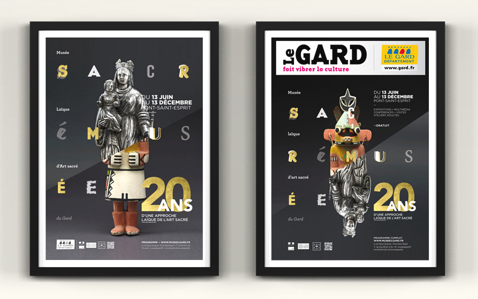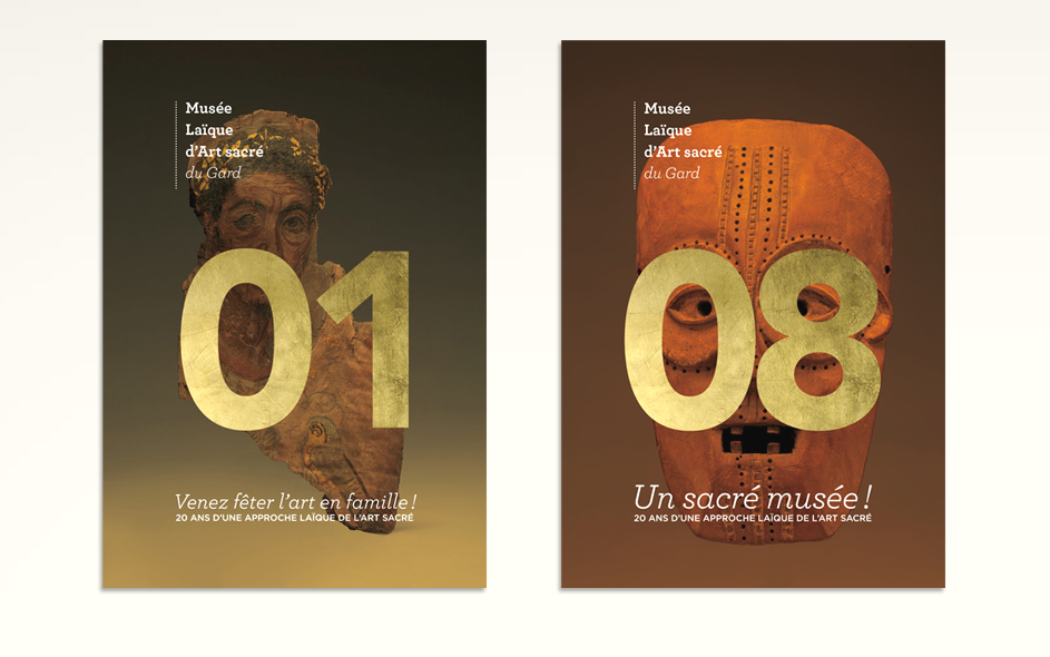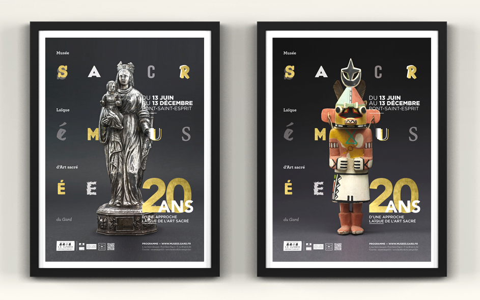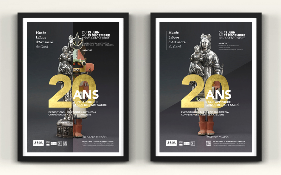 Situé à Pont-Saint-Esprit, le musée d’art sacré du Gard célèbre ses 20 ans. Logé dans une somptueuse demeure médiévale, classée monument historique, le musée d’art sacré propose une approche laïque et originale du fait religieux. Pour célébrer cet anniversaire, expositions, nouveau dispositif numérique, visites, ateliers et conférences sont proposés au public. Autant d’occasions de (re)découvrir ce lieu inattendu, fleuron du patrimoine architectural gardois et sa collection de haut niveau ! Moment charnière s’il en est, cet anniversaire des 20 ans fut l’occasion pour nous, en collaboration étroite avec la direction, de poser les bases de la future identité et de la communication du musée, tout autant que de travailler à tous les éléments de scénographie et de médiation online et offline. Photographies : M. Daspet et JL. Maby.