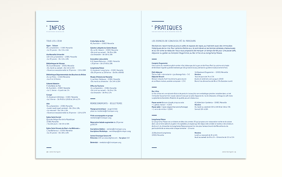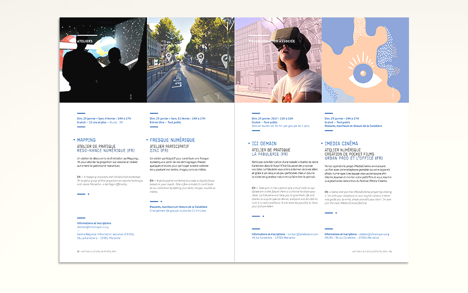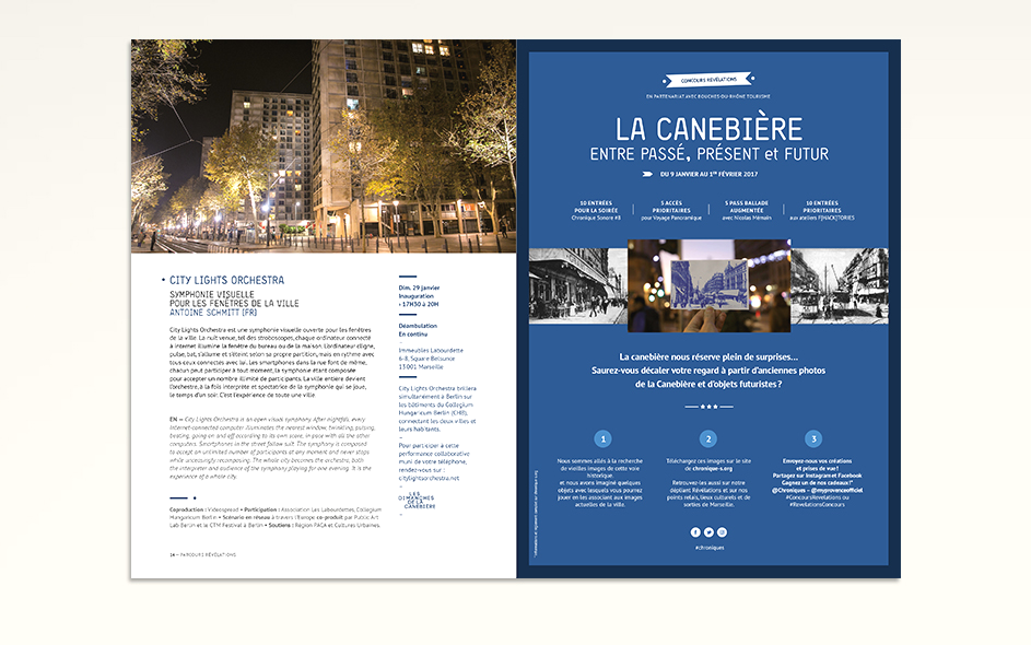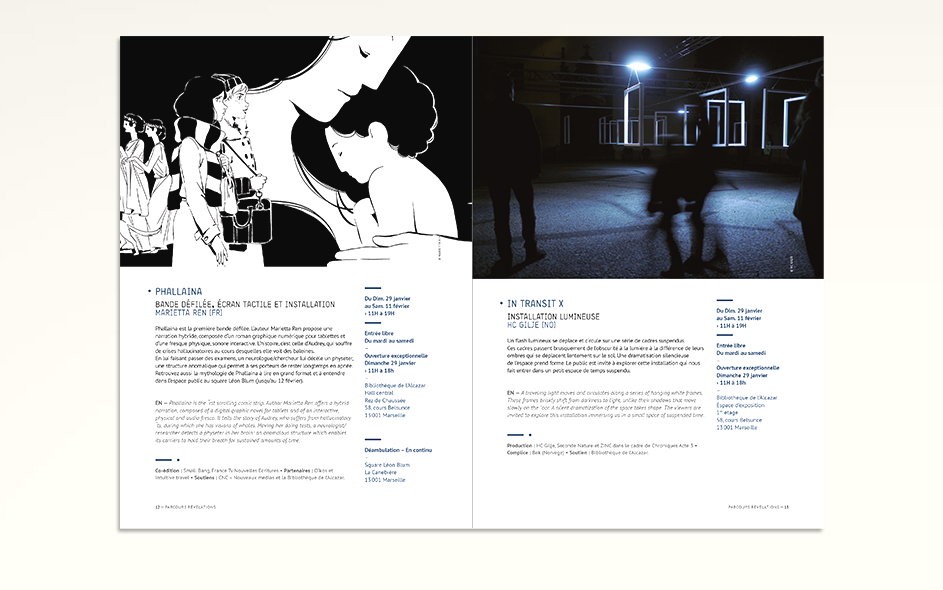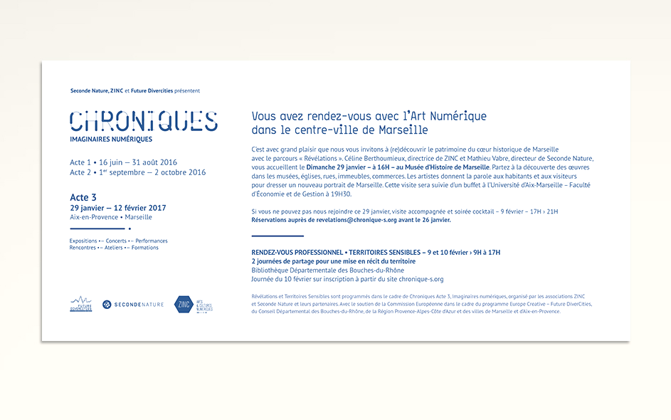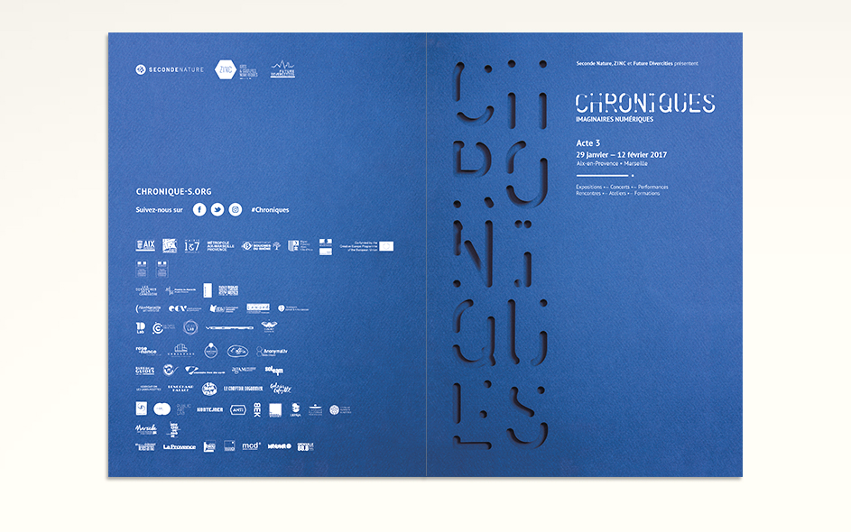 Chroniques, Imaginaires numériques, est une invitation à découvrir la diversité des esthétiques contemporaines et la vitalité du territoire. Pendant deux semaines Seconde Nature et ZINC, avec les acteurs des arts et cultures numériques investissent le centre ville de Marseille. Le parcours Révélations vous invite à re-découvrir le patrimoine en plein cœur historique de la ville. Les artistes investissent musées, églises, rues, immeubles, commerces, donnent la parole aux habitants et visiteurs pour dresser un portrait de Marseille. Ce rendez-vous a été pensé et construit avec près d’une centaine de professionnels ; des associations culturelles, des bibliothécaires, des médiateurs, des étudiants, des commerçants et, bien entendu, des artistes. Au fil des Chroniques, nous avons travaillé sur plusieurs marqueurs avec comme dénominateur commun : la culture, l’art et la technologie au centre des questions et des enjeux des territoires.