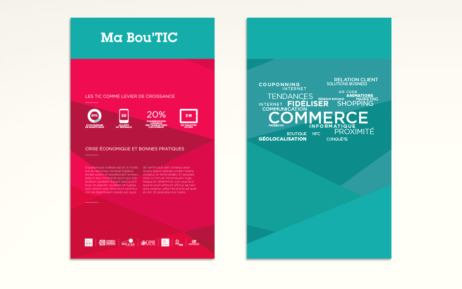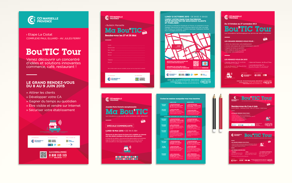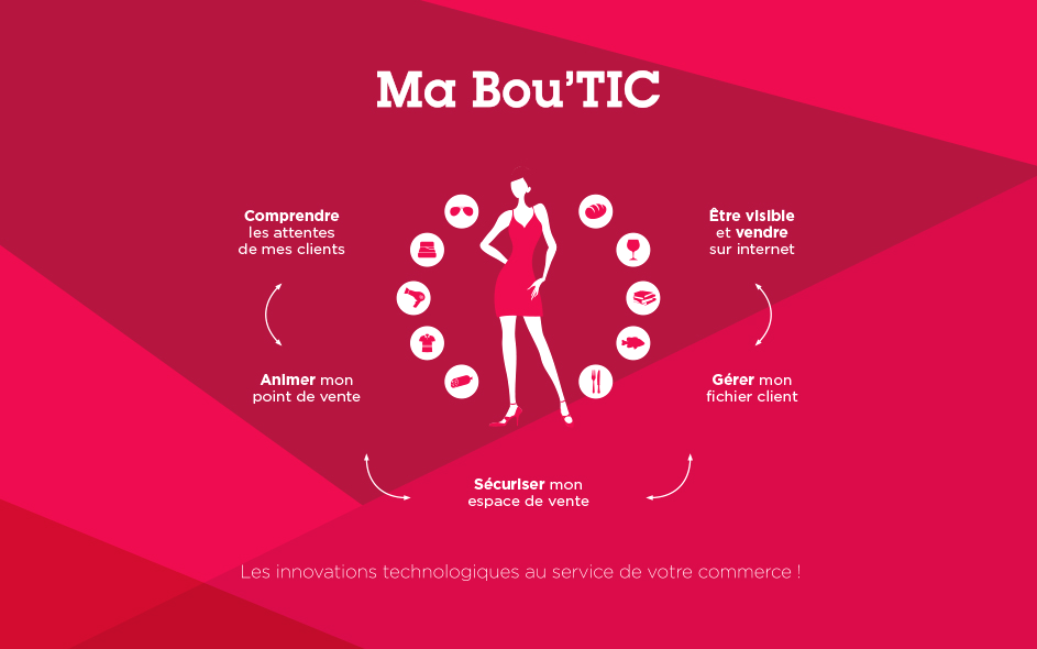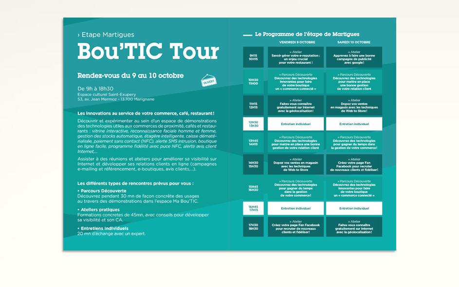 Ce dispositif mobile sillonne les villes du territoire pour des journées de sensibilisation émaillées de réunions et d’ateliers pour améliorer sa visibilité sur Internet et développer ses relations clients en ligne (campagnes e-mailing et référencement, e-boutiques, avis clients,…). Outre l’identité et les différents supports, nous avons travaillé à la signalétique et l’aménagement des vitrines et lieux d’accueil.