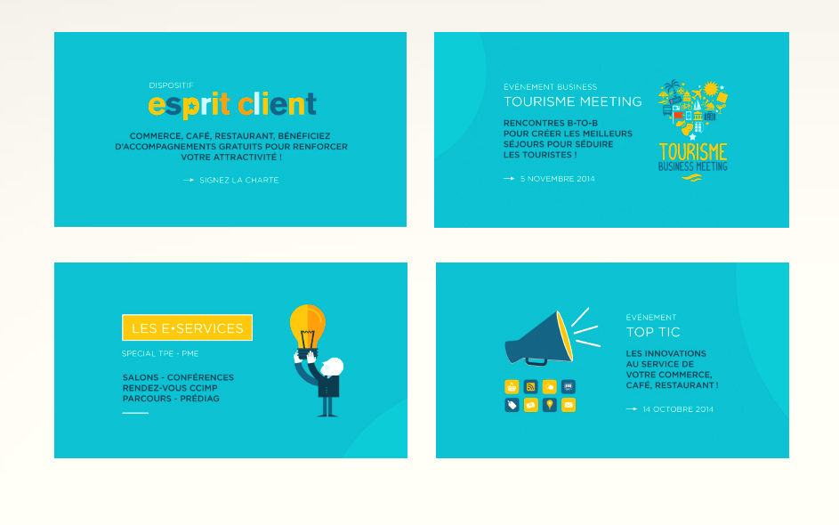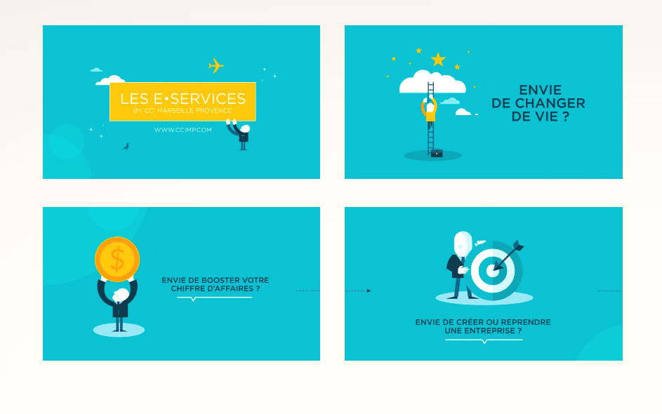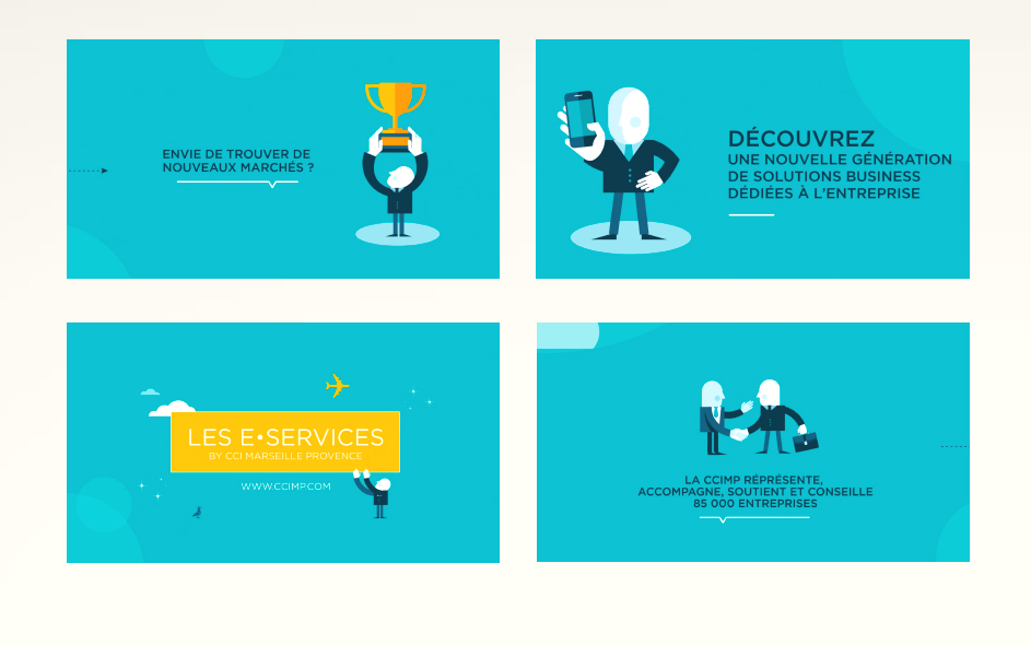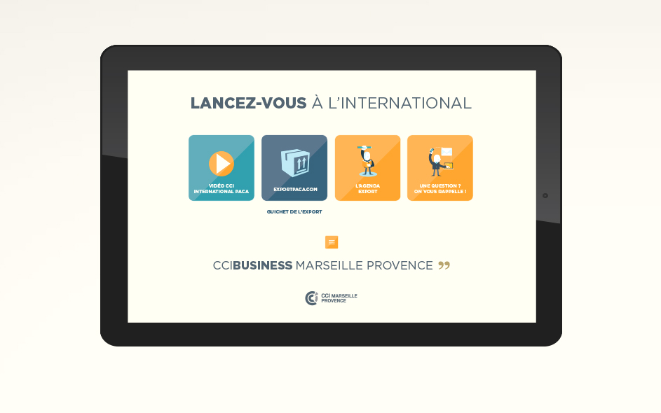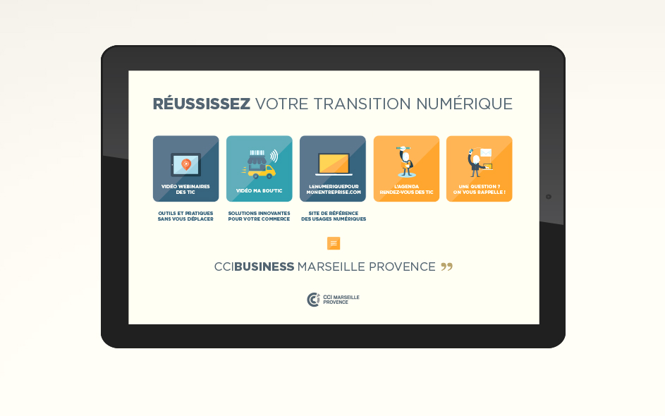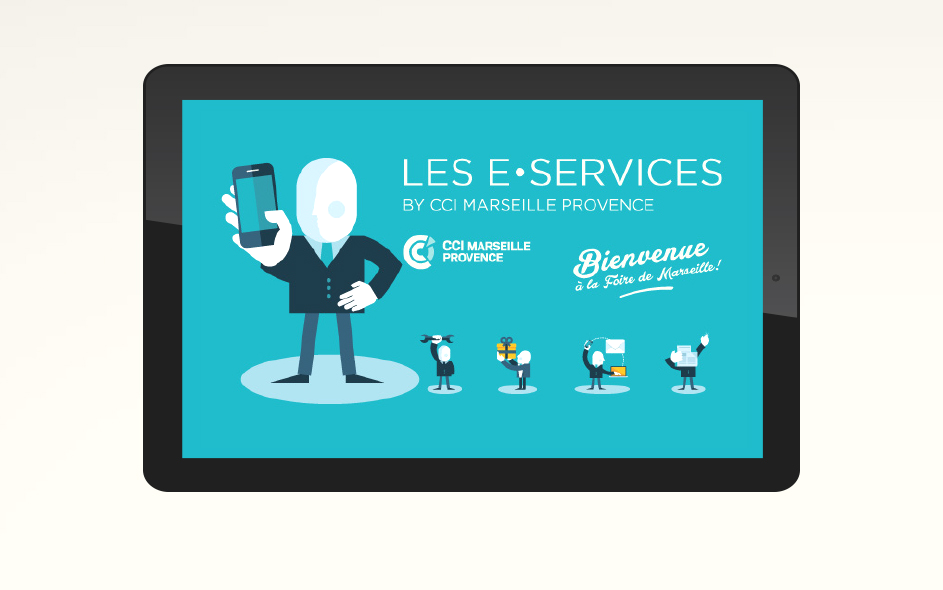 A l’occasion de « La Foire de Marseille » et ensuite du « Salon des Entrepreneurs Marseille Provence » la CCI Marseille Provence a souhaité mettre en avant son investissement dans la numérisation et la création de nouveaux services en lignes aux entreprises du territoire. Nous avons créé un série d’affiches et une webapp centralisant tous les services. Ciblé pour une audience large, la campagne se veut didactique et se déploie autour d’un personnage d’entrepreneur bonhomme avec pour volonté de faciliter l’utilisation de l’outil. Ce dispositif est aujourd’hui généralisé à tous les points d’accueil sous la nouvelle bannière « CCI Business » et un outil de gestion en permet la customisation en fonction des thématiques à mettre en avant.