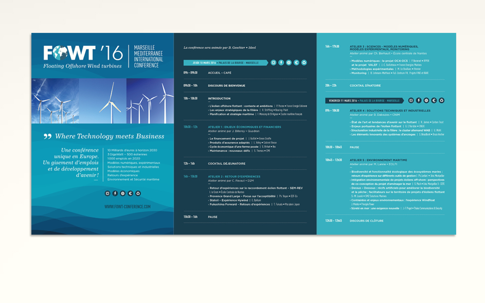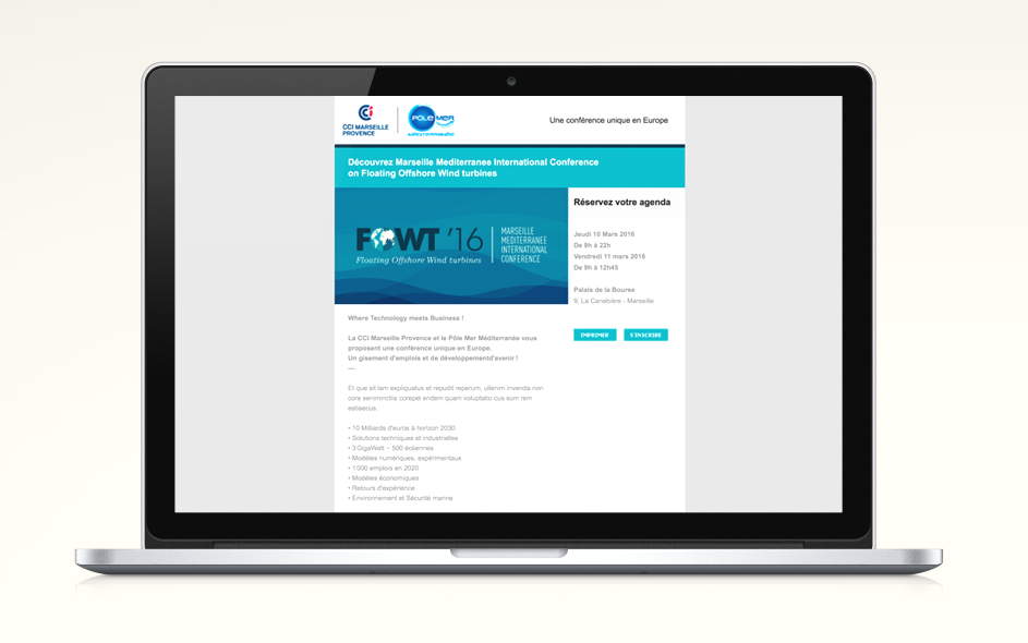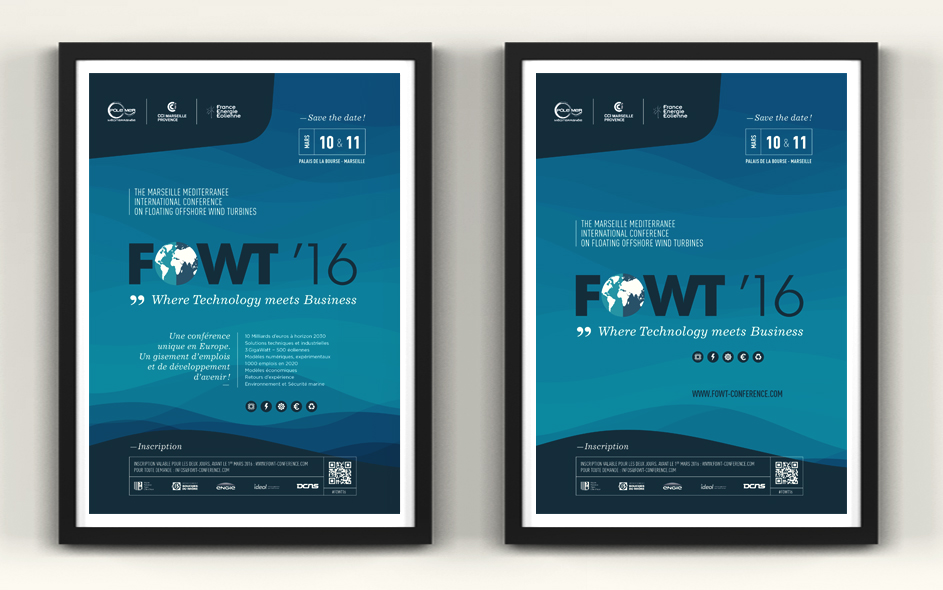 Le Pôle Mer Méditerranée et la CCIMP ont décidé de participer à leurs niveaux à l’émergence en région de l’Eolien Offshore Flottant, filière et spécialisation d’avenir. Pour leur 3e édition de la « Marseille Méditerranée International Conference on Floating Offshore Wind Turbines » ils désiraient se doter d’une ligne graphique afin de renforcer leur communication. Leurs cibles : les laboratoires spécialisés ; les PME/PMI, ETI et start-up innovantes ; les grandes entreprises participant déjà à un ou plusieurs projets pilotes. Les objectifs : renforcer l’idée d’expertise et la dimension internationale de l’événement. Nous avons décidé de simplifier l’acronyme, sa définition, son explication ; d’y apposer une baseline claire sur les objectifs. Nous sommes volontairement sortis de l’imagerie « éolienne » pour travailler dans un univers d’ondes bleues.