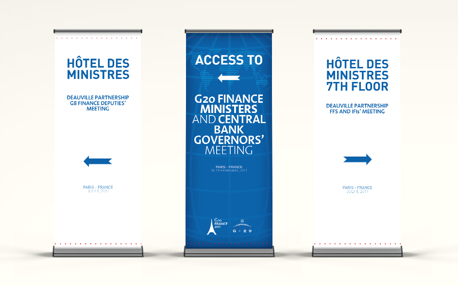 Sous la Présidence Française. A Paris Bercy en Janvier, Février et Juillet — Réunion des ministres des finances et des gouverneurs de banque centrale, à Deauville en Juillet, en Chine, à Nankin en Mars. Déclinaison logo et charte pour l’étape Marseillaise en septembre. De la signalétique au menu des repas, en passant par les macarons des moyens de transports, les plans, les book métiers et sécurité, les badges et autres pin’s souvenirs. Plus de 1000 fichiers par événement.