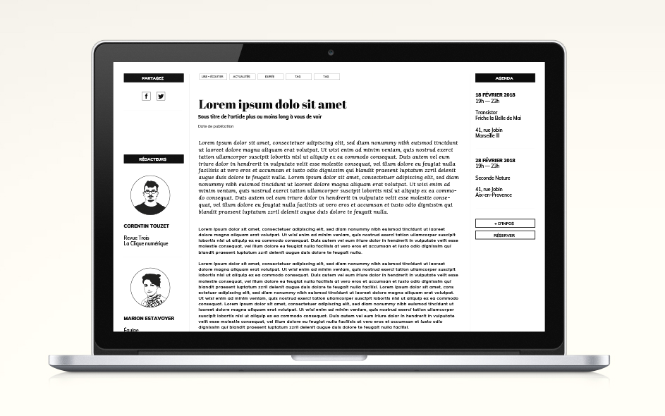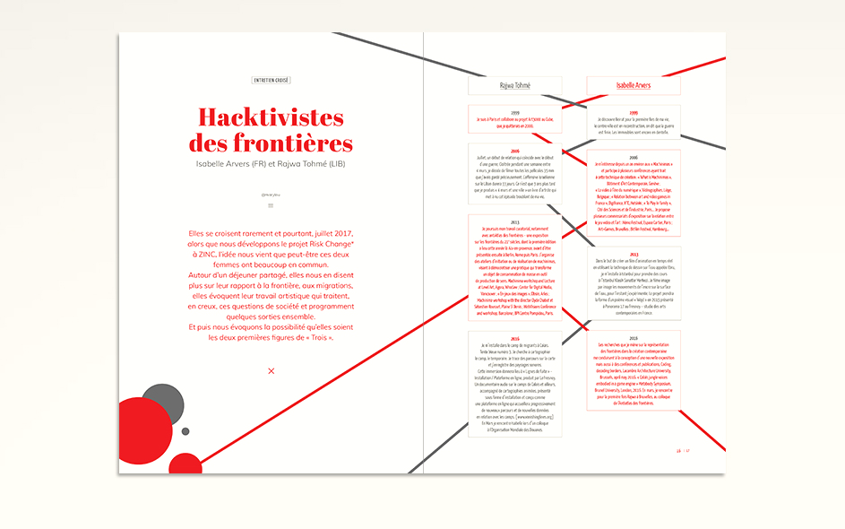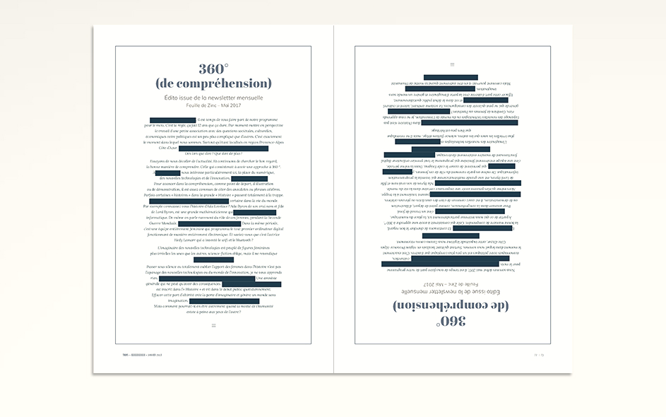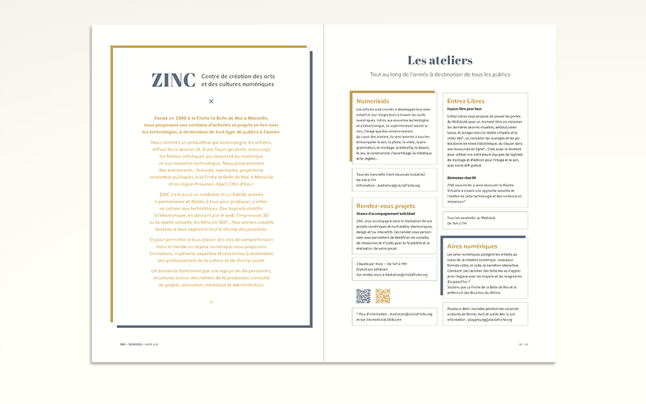 Avec Marylou Bonnaire et l’équipe de Zinc nous avons commencé à travailler sur une Revue. Les buts poursuivis étaient multiples. Unifier la communication de Zinc, mettre en musique toute son action, toute sa contribution à la marche du monde ;-) et retrouver en un seul objet central l’ensemble des activités, des actualités et la force créatrice de l’association. Cette revue devait permettre de prolonger les idées développée sur le terrain par les équipes de Zinc, les artistes et les chercheurs. Cette idée de Revue, de brand content devait se retrouver dans le nouvel outil web que vous retouverez aussi en fin de présentation. Projets non aboutis mais que je tenais à vous présenter.